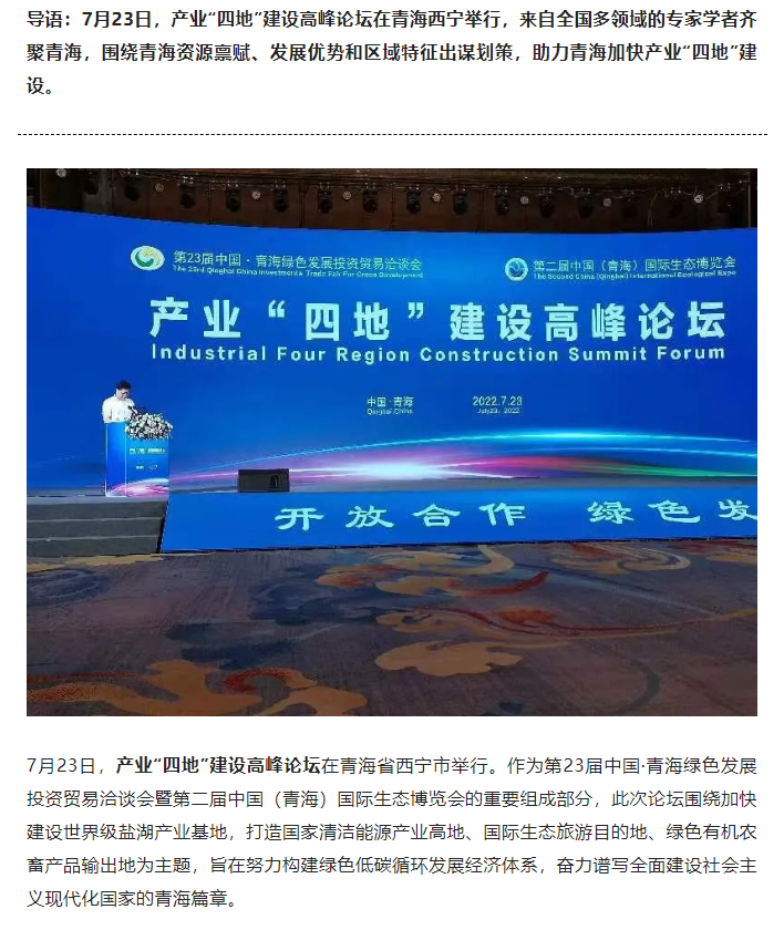 7月23日,产业“四地”建设高峰论坛在青海西宁举行,来自全国多领域的专家学者齐聚青海,围绕青海资源禀赋、发展优势和区域特征出谋划策,助力青海加快产业“四地”建设。