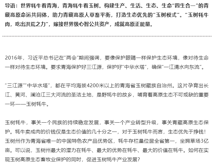 世界牦牛看青海,青海牦牛看玉树。构建生产、生活、生态、生命“四生合一”的青藏高原命运共同体,助力青藏高原人草畜平衡,打造生态优先的“玉树模式”。“玉树牦牛肉,吃出洪荒之力”,嫁接世界级心智公共资产,成就高原正能量。