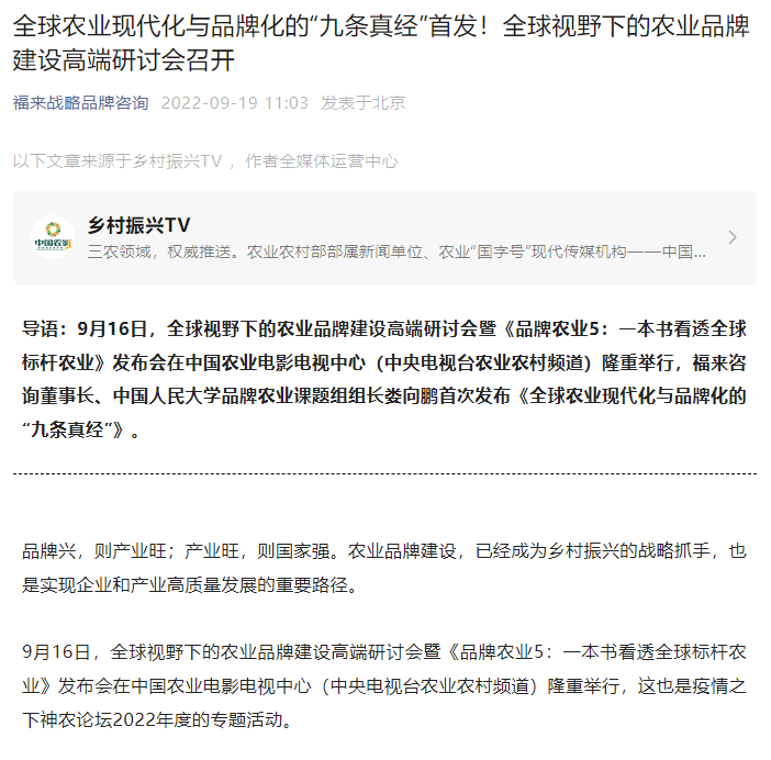 全球农业现代化与品牌化的“九条真经”首发!全球视野下的农业品牌建设高端研讨会召开